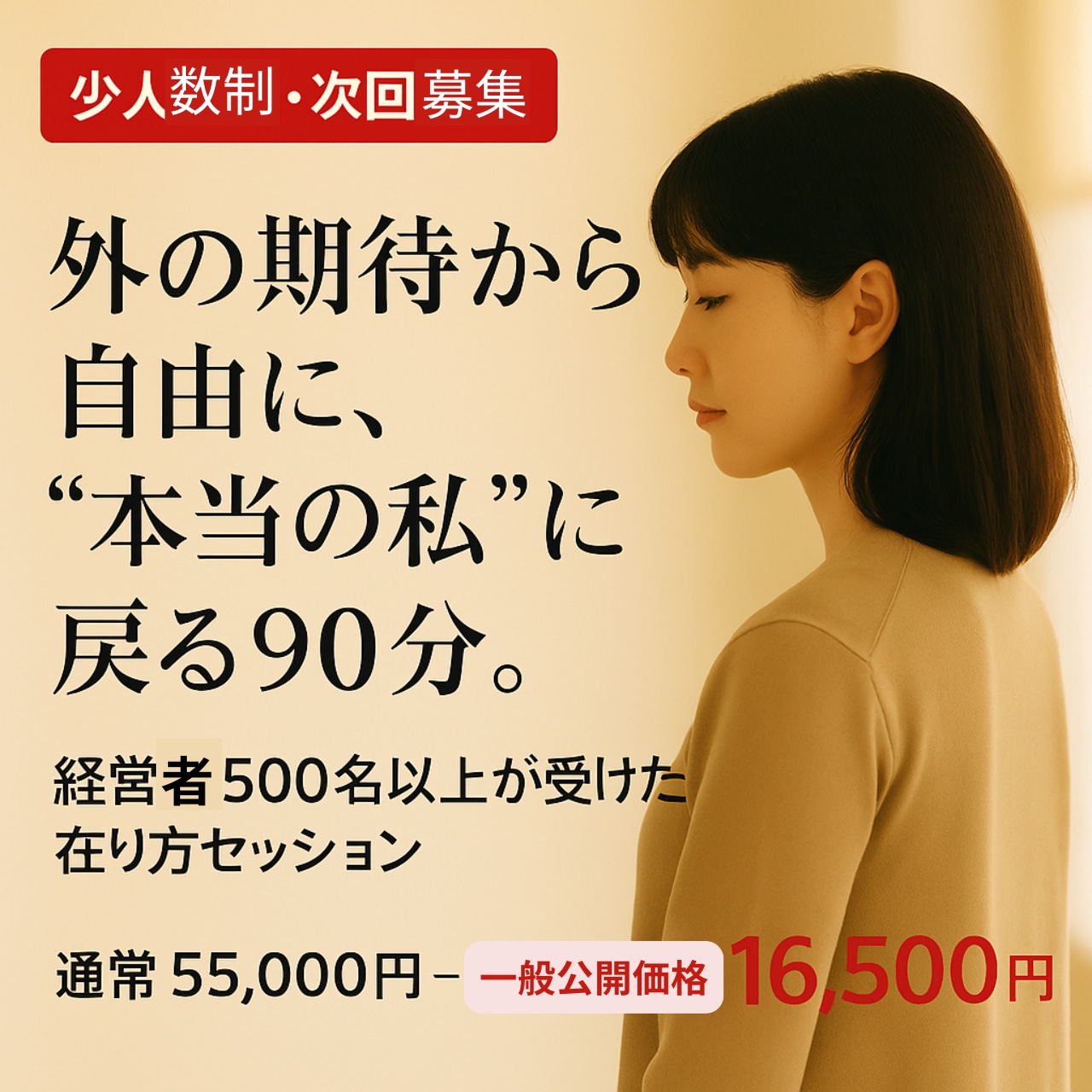 このセッションは、これまで経営者を中心に500名以上にご受講いただいてきた、完全オーダーメイドの「在り方を整えるセッション」です。